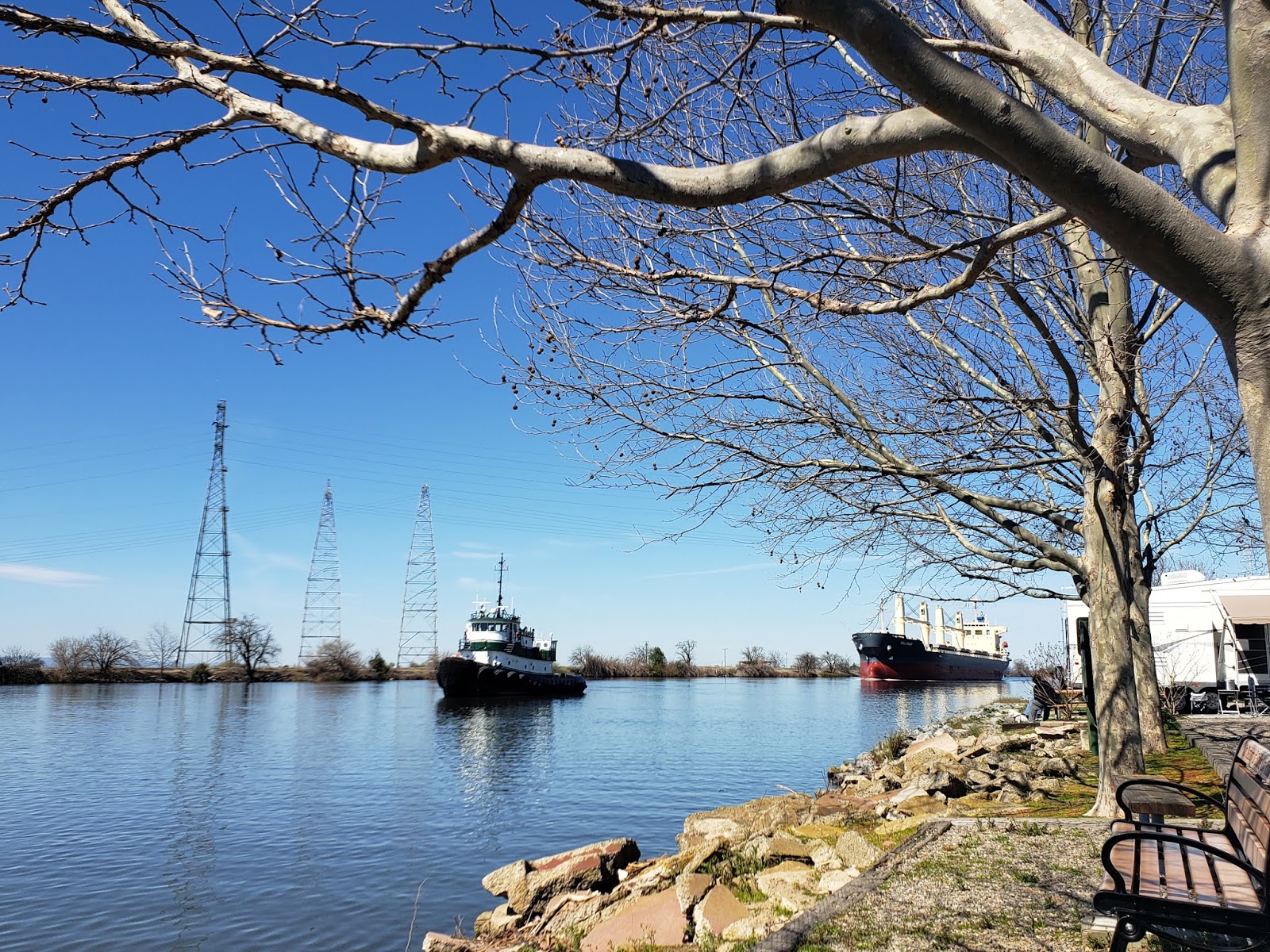 All sites feature great views of activity on the water everything from fishing to waterskiing to ocean going freighters passing to and from the port of stockton.